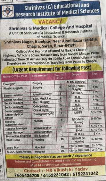 Shrinivas (G) Educational & Research Institute of Medical Sciences ने अपने Medical College & Hospital के लिए कई महत्वपूर्ण पदों पर तुरंत भर्ती (Urgent Requirement) की घोषणा की है।
