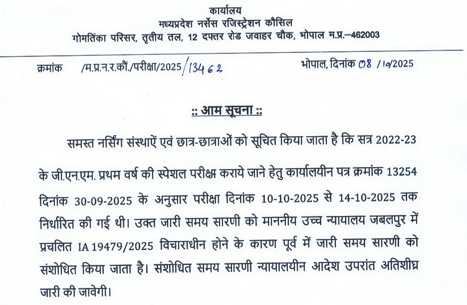 मध्यप्रदेश नर्सिंग रजिस्ट्रेशन काउंसिल, भोपाल द्वारा सत्र 2022-23 के जी.एन.एम. प्रथम वर्ष के विद्यार्थियों को सूचित किया गया है कि उनकी स्पेशल परीक्षा की पूर्व निर्धारित तिथियाँ (10 अक्टूबर 2025 से 14 अक्टूबर 2025) में बदलाव किया गया है।