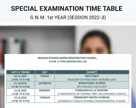 प्रिय जी.एन.एम. प्रथम वर्ष के विद्यार्थियों,Madhya Pradesh Nurses Registration Council, Bhopal द्वारा G.N.M. 1st Year (Session 2022-23) की विशेष परीक्षा (Special Examination) का टाइम टेबल जारी कर दिया गया है। यह आप सभी के लिए एक अत्यंत आवश्यक सूचना है, कृपया इसे ध्यानपूर्वक पढ़ें और अपनी तैयारी शुरू करें।