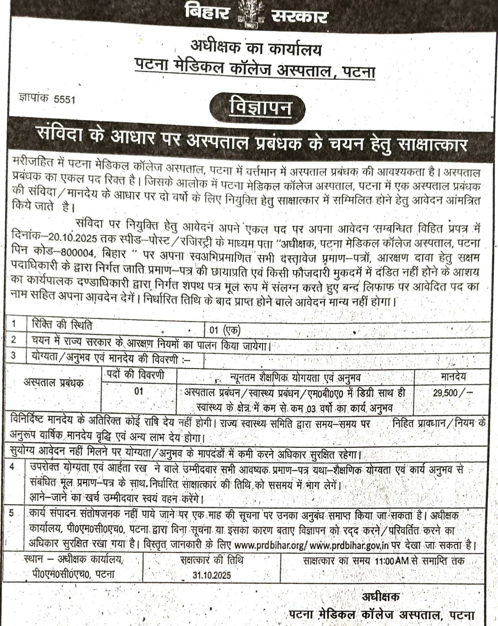 संविदा के आधार पर अस्पताल प्रबंधक के चयन हेतु साक्षात्कार मरीजहित में पटना मेडिकल कॉलेज अस्पताल, पटना में वर्त्तमान में अस्पताल प्रबंधक की आवश्यकता है। अस्पताल प्रबंधक का एकल पद रिक्त है। जिसके आलोक में पटना मेडिकल कॉलेज अस्पताल, पटना में एक अस्पताल प्रबंधक की संविदा / मानदेय के आधार पर दो वर्षों के लिए नियुक्ति हेतु साक्षात्कार में सम्मिलित होने हेतु आवेदन आंमत्रित किये जाते है।